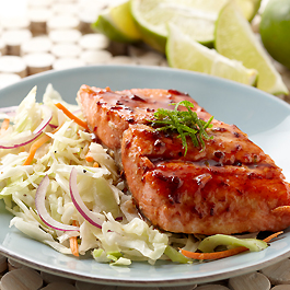2. Stir honey and chipotle purée in a small bowl until well combined. Store refrigerated for up to 2 weeks. 3. Cut 2 pieces of wide, heavy-duty aluminum foil about 6-in. longer than the salmon side. Stack the foil pieces (shiny side down) on a baking sheet and spray generously with cooking spray. Place the salmon, skin side down, in the middle of the foil. Fold the foil sides and ends up (1 to 2-in.) to make a shallow pan around the salmon, leaving at least a 1-in. margin around the fish. Season salmon with salt and pepper. 4. Carefully transfer the foil pan to the center of the preheated grill. Do not cover the salmon or close the foil over the salmon. Close grill cover and cook for 5 min. Spread the glaze on the salmon (1 Tbsp. per salmon portion or 1/3 c. per salmon side). Close grill and continue to cook about 5 to 7 min. more. Cook just until fish is lightly translucent in the center - it will finish cooking from retained heat. Remove from the grill and let rest a few minutes before serving. 5. Garnish with lime zest and serve with lime wedges. Variation: Salmon can also be roasted in an oven preheated to 375°F or pan-seared and finished in the oven. Cook just until lightly translucent in the center; be sure to let the salmon rest a few minutes before serving. * Purée a can of chipotle peppers in adobo sauce with a hand blender, blender or food processor until smooth. Freeze any remaining purée for another use. |