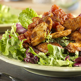 2. Heat the oil in a 12-in. skillet over medium-high heat. Add the chicken and cook for 15 min. or until well browned and cooked through, stirring often. Remove the chicken from the skillet, cover and keep warm. 3. Stir the salsa and water in the skillet and cook until the mixture is hot and bubbling. Divide the greens among 6 plates. Top with the chicken and the salsa mixture. * Ingredient Note: We develop our recipes using a 4-to 5-oz. skinless, boneless chicken breast half per serving. If you're using larger chicken breasts they may require a little longer cooking time. Nutritional information: