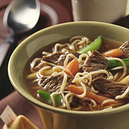 2. Combine broth, remaining 1 Tbsp. garlic and remaining 1 tsp. ginger in stockpot; bring to a boil. Stir in pasta and vegetables; bring to boil. Reduce heat and cook, uncovered, 4-6 min. or until pasta and vegetables are tender, stirring occasionally. 3. Meanwhile, heat large nonstick skillet over medium-high heat until hot. Add half of beef; stir-fry 1-3 min. or until outside surface of beef is no longer pink. Remove from skillet. Repeat with remaining beef. Keep warm. 4. Remove soup from heat; stir in beef and soy sauce, if desired. * Recipe Courtesy of The Beef Checkoff Nutritional information: