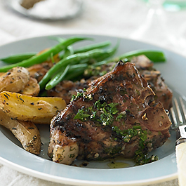 Fresh Mint and Garlic Marinated Grilled Lamb Loin Chops with Roasted Fingerling Potatoes and Green Beans