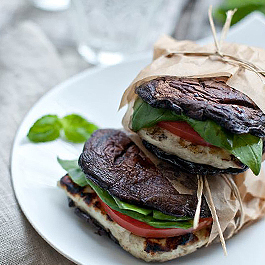 2. When the grill is hot, grill the mushrooms on the gill side first for about 5 min. or until they start to sweat. Flip and grill 2-3 min. more. Add halloumi to the grill and grill 2 min. on each side over relatively high heat until grill marks form on the cheese and it becomes soft and pliable. Sprinkle salt and pepper onto the tomato to taste. 3. Assemble the "burger" with the mushroom as the bun, the halloumi cheese as the burger, the lightly salted tomato and fresh basil leaves. Wrap and serve hot. Recipe and photos courtesy of the Mushroom Council and mushroominfo.com Nutritional information: