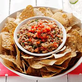 2. Mash beans with potato masher or back of wooden spoon. Add chicken stock as needed to desired consistency. Add cilantro and tomato. Season with salt and pepper to taste. Serve with fried taco chips. 3. To make taco chips, heat canola oil in large, heavy-based pan to 375º F (190º C). 4. Arrange tortillas in stack; cut into 6 equal wedges. 5. Fry tortillas, turning once, in batches and without crowding, for 1-2 min. or until crisp and golden. Drain on paper towels. Season with salt. 6. Serve bean spread with chips and store extra chips in air-tight container. * Serving Size: 2 Tbsp. (30 mL) bean spread with 2 taco chips. * Recipe courtesy of CanolaInfo. Nutritional information: