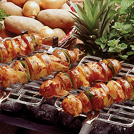 2. On each of 12 skewers, thread ingredients in the following order: a pepper to secure food, potato, pineapple, pepper, onion, salmon and another onion. Repeat, beginning with potato, until each skewer holds about eight in. of ingredients. End each skewer with pepper to secure. Continue with remaining skewers. 3. Place skewers in a 13 x 9-in. pan and drizzle Italian dressing over them. Cover with plastic wrap and let marinate in the refrigerator for at least 1 hr., or until time to grill. Prepare grill. 4. When grill is ready, lightly oil the grill tray to prevent kebabs from sticking. Grill kebabs, turning and basting often with barbecue sauce, about 6-7 min. or until brown. Serve kebabs with lime wedge garnish. * Recipe courtesy of Idaho Potato Commission. Nutritional information:
