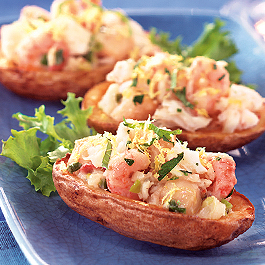 2. Melt butter in pan add seafood, garlic and scallions. When almost done, deglaze pan with wine, add lemon balm, stir. 3. Add bacon, reserved potato and heavy cream, Stir. Season with sea salt. 4. Place under broiler for 15 seconds and serve on a bed of greens. Garnish with chopped parsley and lemon zest. * Recipe courtesy of Wayne Oden, Managar, Hartford Hospital, Hartford, CT |