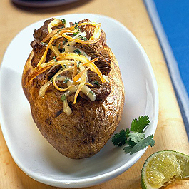 * 4 large Idaho® potatoes (16-20 oz. each), scrubbed * 24 oz. sirloin steak, trimmed, and sliced into 1/4-in. thick strips * 1 c. flour * 1 tsp. salt * 1/2 tsp. white pepper * 1 Spanish onion * 1 c. vegetable oil * 8 oz. Monterey Jack cheese, shredded * 1 small bunch cilantro, chopped Marinade: * 3 cloves garlic, finely chopped * 1/4 c. soy sauce * 1/4 c. fresh lime juice * 2 Tbsp. Worcestershire sauce * 1 Tbsp. salad oil * 1 tsp. salt * 1/2 tsp. black pepper * 1/2 tsp. whole thyme * 1 pinch cayenne pepper What to do: