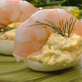 2. In a mixing bowl, mash yolks with a fork and add remaining ingredients. Spoon the yolk mixture into the egg white halves, mounding slightly. 3. Top each egg half with a seasoned shrimp and wedge into yolk filling. Arrange on a platter, garnish with parsley and chill until ready to serve. * Recipe Courtesy of Florida Department of Agriculture Bureau of Seafood and Aquaculture. |