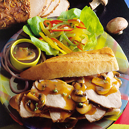 2. Scrape any pan drippings into a microwave-safe measuring cup; add water to measure 1/3 c. Cover and microcook on HIGH for 20-30 seconds, until boiling. 3. Place mushrooms in microwave-safe container, top with butter and cover with plastic wrap. Microcook on HIGH for 45-60 seconds until mushrooms are tender. Slice roast and place in rolls; spoon over mushrooms and some of the pan juices. Serve immediately. * Au jus is the phrase that describes serving meat with its own natural juices. A simple recipe that creates delicious results. Don't forget to serve Au Jus alongside of the sandwiches. Serve with a crisp salad and roasted potatoes. * Recipe and photo courtesy of National Pork Board. For more recipes visit: www.PorkBeInspired.com Nutritional information: