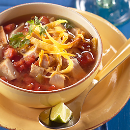 * 1 medium onion, chopped * 1 Tbsp. olive oil * 2 cloves garlic, minced * 1 tsp. ground cumin * 1 quart chicken broth * 1 15 oz.-can diced tomatoes * 1 4-oz. can diced green chiles * tortilla chips, crumbled (to garnish) * Cheddar cheese, shredded (to garnish) * lime wedges, (optional) * cilantro leaves, (optional) What to do: