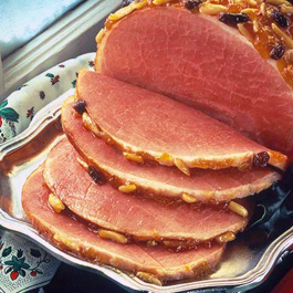 2. Place ham in a shallow roasting pan. Bake in a 325°F oven for 2 hours (allow 15 minutes per pound) or until thermometer registers 140°F. Spoon glaze over ham once or twice during the last 30 minutes of cooking time. Slice thinly to serve. * Nothing could be easier than serving a boneless ham. Dress yours up with this easy and tempting glaze. Serve Cranberry Waldorf Salad, roasted potatoes, Green Beans with Glazed Onions, and dinner rolls. * Recipe and photo courtesy of National Pork Board. For more recipes visit: www.PorkBeInspired.com Nutritional information: