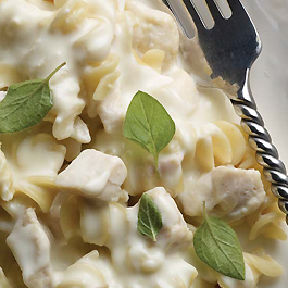 2. Mix soup, half-and-half, pepper, garlic powder, parmesan cheese, and chicken in a large pot. Cook for 5 minutes over medium heat, stirring often. Heat to 165°F or higher for at least 15 seconds 3. Combine noodles and sauce right before serving. Serve hot. * Note: Keep noodles and sauce separate until serving time. Sauce will thicken upon standing. For more recipes or information, please visit teamnutrition.usa.gov Nutritional information: