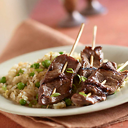 2. Poner dos brochetas de bambú de 6 pulg. (15 cm) de largo a remojo en agua durante 10 minutos. Escurrir. Retirar la carne de la marinada. Desechar la marinada. Ensartar la carne deslizándola hacia adelante y hacia atrás en cada brocheta. 3. Colocar las brochetas en una parrilla a fuego medio en brasas cubiertas de ceniza. Asar tapado de 5 a 7 minutos (a fuego medio en una parrilla de gas pre-calentada, de 6 a 8 minutos), dándole la vuelta de vez en cuando y untándole la 1/4 de taza marinado restante. 4. Servir las brochetas con arroz si lo desea. Agregar las cebollas. * Esta receta es una fuente excelente de proteínas, niacina, vitamina 6, vitamina 12, selenio y zinc; y una buena fuente de colina. Nutritional information:
