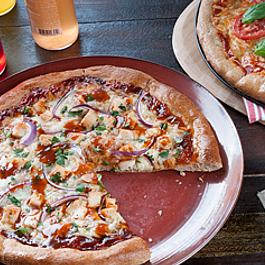 2. To prepare pizza dough, stir whole wheat flour; lightly spoon into a measuring cup and level flour. 3. In large mixing bowl, combine whole wheat flour, yeast and salt. Blend in water, oil and honey or sugar. Stir by hand vigorously until all ingredients are well-mixed; about 3 minutes. Cover with plastic wrap and let rise to desired size. 4. Place dough in greased 15 x 10 x 1-in. jelly-roll pan or 12 to 14-in. pizza pan. Press dough to cover bottom of pan and up sides to form a rim. 5. Add pizza sauce of your choice and your favorite pizza toppings; bake in oven 15 to 20 minutes or until crust is golden brown and toppings are done. Notes * Rising and baking times may be extended. * Some people prefer to "prebake" the crust for about 3 minutes before adding the toppings. * Crust will be "crispier" than if not prebaked. * The optional ingredient, gluten, may be added to help the dough rise resulting in a thicker, chewier crust. * Nutritional analysis for 1 slice of crust only. Nutritional information: