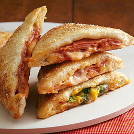 2. Open can of dough. (Do not unroll.) Cut dough crosswise in half. 3. Unroll 1 half on baking sheet sprayed with cooking spray; spread with pizza sauce to within 1/2 inch of edges. Sprinkle with mozzarella. Top 1/3 of dough with turkey, then cover second third with broccoli and corn. Leave remaining third topped with just the mozzarella. Unroll remaining dough half over filling; crimp edge with fork. Cut dough crosswise into thirds, then cut each third diagonally in half. (Do not separate dough.) Brush with water; sprinkle with Parmesan. 4. Bake 15 to 19 min. or until golden brown. Cool slightly. |