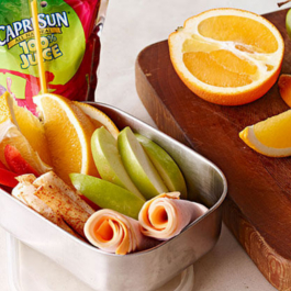 2. Sprinkle jicama with seasoning. 3. Pack 2 turkey roll-ups and 1/4 each of the jicama, peppers, apples and oranges in each of 4 airtight containers. Add juice pouches. 4. Refrigerate until ready to pack in a cooler before heading out the door. * Recipe courtesy of Kraft Kitchen Nutritional information: