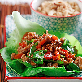 2. Add garlic and ginger and cook another minute, then add red pepper, green onions and cilantro stems and cook 3-4 minutes until vegetables are soft. Add hoisin sauce and stir to heat through. 3. Serve pork mixture alongside small bowls of peanuts, cilantro and lettuce leaves. Instruct guests to spoon some pork into their leaf, top with peanuts and cilantro, wrap and eat. * Recipe courtesy of Julie Van Rosendaal and CanolaInfo. Nutritional information: