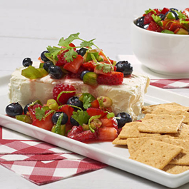 2. Refrigerate 10 min. 3. Place cream cheese on serving plate; top with berry mixture. 4. Serve with WHEAT THINS. Variation: Instead of spooning the berry mixture over the brick of cream cheese, spread the softened cream cheese onto the bottom of a pie plate before topping with the berry mixture. Nutritional information: