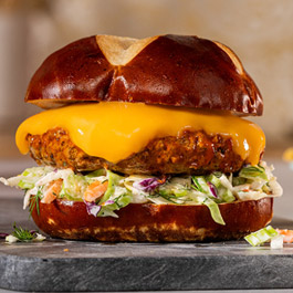 * 1 Tbsp. McCormick® Grill Mates® Montreal Steak Seasoning * 1/2 cup Frank's RedHot® Buffalo Wing Hot Sauce * 8 slices Sargento® Sliced Sharp Natural Cheddar Cheese * 4 split pretzel buns, toasted * 1 1/3 cup prepared coleslaw What to do: