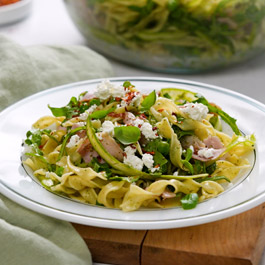 2. Meanwhile, using a vegetable peeler, shave the asparagus into thin 3. In a large bowl, toss the noodles, peas, asparagus, arugula, ham and pesto together until coated. Top with goat cheese, basil and crushed red pepper ™akes. Bright, bold, and satisfying. This refreshing noodle salad combines tender No Yolks® noodles with creamy goat cheese, savory ham, and zesty pesto. Perfect as a light lunch or a crowd-pleasing side. |