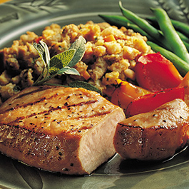 2. Stir together honey & hot pepper sauce. 3. Grill chops over medium hot fire 8-12 min., basting with honey-pepper sauce mixture, until internal temperature on a thermometer reads 145°F, followed by a 3-min. rest time. * Nutritional information does not include suggested side dishes **Exceeds saturated fat recommendation of 1.5 grams per serving or less. To lower the saturated fat content, trim all visible fat from the pork chop. * Recipe and photo courtesy of National Pork Board. For more recipes visit: www.PorkBeInspired.com Wine pairings: