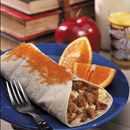 2. Stir in chilies. 3. Combine eggs and water in medium bowl. Beat with wire whisk until well mixed. Pour eggs into skillet; sprinkle with sausage. 4. Cook over medium heat, gently lifting portions with spatula so uncooked portion flows underneath, until eggs are set (3-5 min.). 5. For each serving, place 1/2 slice cheese in center of warm tortilla. Spoon 1/3 c. eggs over cheese; spread with 1 Tbsp. picante sauce. Top with 1/2 slice cheese. Fold edges over filling, overlapping slightly. Roll up tortilla from bottom to enclose filling. Repeat with remaining ingredients. * Recipe and photo courtesy of National Pork Board. For more recipes visit: www.PorkBeInspired.com |