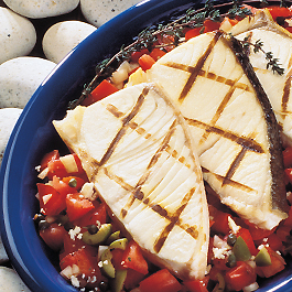 2. Place seafood steaks on an oiled grill over hot coals. Grill 10 min. per inch of thickness, measured at thickest part, or until just done and center flakes with a fork. Turn steaks once or twice during grilling. 3. Serve with Mediterranean salsa. Wine pairings: