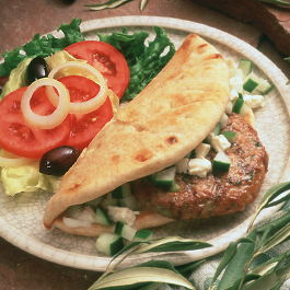 2. In another small bowl combine yogurt, cucumber, salt and 1 tsp. herb mixture. Set aside. 3. Place turkey patties in pan. Sprinkle lemon pepper/onion mixture over both sides of patties. 4. Heat large non-stick skillet over medium heat for 5 min. 5. Place patties in hot skillet and cook 6-8 min., turning once. Patties should be cooked to an internal temperature of 160°F. 6. Place a burger in each pita half. Add two tomato slices and yogurt sauce as desired. Wine pairings: