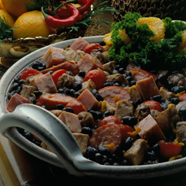 2. Caliente el horno previamente a 350º F. En una olla pesada y grande (™Dutch oven™), mezcle los frijoles, las 6 tazas de agua y todos los demás ingredientes. Deje hervir, y si es necesario, quite la espuma. Cubra y meta al horno. Hornee durante 1-1/2 horas. Quite la tapa y hornee otros 30 minutos, mezclando ocasionalmente. 3. Sirva inmediatamente con pan de maíz, si así lo desea. O deje enfriar un poco, luego cubra y refrigere durante la noche. Quite la grasa de la superficie. Antes de servir, vuelva a calentar lentamente la Feijoada. Sirva la Feijoada con arroz blanco caliente y con rebanadas de naranja y cebolla blanca. * Las receta(s) y fotografía(s) son cortesía del National Pork Board. Para más información, visita el sitio www.PorkBeInspired.com Nutritional information: