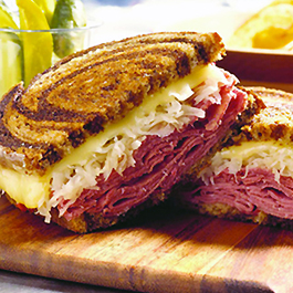 2. Heat large nonstick skillet over medium heat until hot. Place 2 bread slices, butter side down, in skillet. Top each bread slice with 2 slices cheese, 1/4 of sauerkraut and 4 oz. corned beef. Spread 1 Tbsp. dressing on unbuttered side of 2 bread slices; top sandwich with bread slice butter side up. 3. Cook sandwiches 4-6 min. or until bread is golden brown and cheese is melted, turning once. Repeat with remaining sandwiches. Serve with Thousand Island dressing, if desired. * Makes 4 sandwiches. * Recipe Courtesy of The Beef Checkoff Nutritional information: