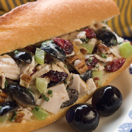 * 4 oz. sliced roasted turkey, diced (1/2-inch) * 1 c. California Ripe Olives, wedged * 1/2 c. chopped dried cranberries * 1/3 c. diced celery (1/4-in.) * 1/4 c. chopped chives * 1/4 c. coarsely chopped pecans * 1/4 c. low fat mayonnaise * 1 (12 oz.) French bread baguette, cut into 4 pieces What to do: