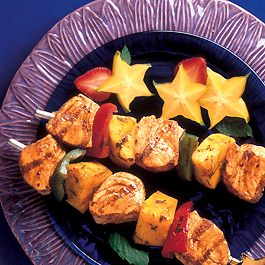 2. Blend together oil, lime zest, lime juice, honey, cilantro, ginger, salt and pepper. Divide marinade, reserving 1/4 c. for basting. Marinate seafood cubes in remaining mixture for 30 minutes, turning occasionally. 3. Preheat grill/coals to medium-high heat. Skewer seafood and vegetables alternately on skewers. Place on a well oiled grill and cook about 5 minutes per side, basting vegetables with reserved marinade. Do not overcook. **Exceeds saturated fat recommendation, recommended amount 1.5 grams per serving or less; a majority of the fat in the recipe comes from heart healthier unsaturated fats (e.g. fish and vegetable oil) Wine pairings: