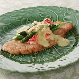 2. Dust pounded cutlet with flour. 3. Sauté both sides of turkey in clarified butter. Remove cutlet from the pan and keep warm. 4. Reduce heat to low and add asparagus and crabmeat to pan. Warm over low flame. 5. Place turkey cutlet on warm dinner plate. Arrange asparagus and crab atop the turkey cutlet. Top with warm béarnaise sauce. Béarnaise Sauce**: 1. In a small saucepan, over medium heat, combine wine, tarragon vinegar, shallot, fresh tarragon and peppercorns. Simmer, uncovered, until reduced by two-thirds. Strain liquid; remove tarragon sprigs and peppercorns. Allow wine reduction to cool. 2. Combine egg yolks and water and whisk mixture until it is light and frothy. Place in the top of a double boiler over barely simmering water. Whisk until the eggs are thickened, about 2 to 4 min. Do not over cook the yolks. 3. Remove eggs from the heat and whip to slightly cool the mixture. 4. While whisking constantly, slowly add warm clarified butter, first a few drops at a time. Once the emulsion starts, the butter may be added at a slightly quicker rate. 5. Stir in reserved chopped tarragon leaves and reserved wine reduction. Season with salt and white pepper. 6. Keep Béarnaise sauce warm in a covered double boiler pan over low heat. **Substitution: You may also use your favorite prepared or dry-packet Béarnaise sauce. Recipe kindly provided by Chef/Owner Russ Adams of Strongbow Inn in Valparaiso, IN. Wine pairings:
