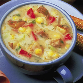 2. Peel the potatoes with a vegetable peeler, although you can leave the peels on if you wish. 3. Using a big sharp knife (and with permission or help) on a cutting board, cut the potatoes in half the long way. Put the halves cut side down on the cutting board and cut each half lengthwise into 4 pieces. Then cut the long slices cross¬wise to make small (about 1 in.) pieces. 4. Get out a large saucepan or pot and put the potatoes in the pot. 5. Open the can of chicken broth and pour into the pot. 6. Add the celery, onion and thyme or oregano and sprinkle with a little salt and pepper. 7. Put the pot on the burner and turn it to High. When the broth starts to boil, turn the heat down to Medium Low so the broth is just barely bubbling. 8. Cover the pot and set the timer for 30 min. 9. Using potholders, carefully remove the cover and poke one of the pieces of potato with a long handled fork or a knife to be sure the potatoes are tender. If the potatoes aren't yet tender, cook another 5 min. 10. Open the pkg. of frozen vegetables and carefully add them to the pot. Add the chicken and cover on the pot. 11. Set the timer so the soup will simmer for 10 more min. 12. Ladle out a small amount of soup into a bowl and taste. Add more salt and pepper if you think it is necessary. Soup can be a special meal, and you can make it. There is some slicing and dicing so be sure to ask permission or for help. You will be very proud to tell your family that you are the soup master! Leftover soup makes a great Saturday lunch. Start the soup about 45 min. before your meal. * For more great potato recipes, please visit potatokids.com or potatoes.com. Nutritional information: