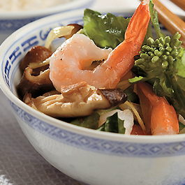 2. Pour canola oil into a large wok and heat over medium high heat. Quickly stir fry shrimp until just cooked. Remove from wok. Add a bit more canola oil if necessary. Add onion, garlic, gai lan stalks (leave out leafy parts until the end of cooking time), ginger, five spice powder, salt and sweet chili sauce. Stir fry for 3-4 min. to cook vegetables. Dissolve corn starch in broth and add to vegetables. Heat mixture for 1 min. 3. Add shrimp and gai lan leaves to the mixture and heat through. Garnish with cashew nuts and serve immediately. Nutritional information: