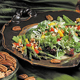 2. In a medium bowl, stir together peppers, pecans, and basil. 3. In a small bowl, whisk together lemon juice, vinegar, mustard, and salt to blend; whisk in oil to make dressing. 4. To serve, mound salad greens in center of serving platter; arrange asparagus in two clusters on opposite sides of greens. Spoon pecan mixture over greens and asparagus; drizzle dressing over all. Nutritional information: