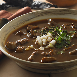 Paso - 1 En una olla grande poner a hervir el espinazo, el ajo y la sal por 30 minutos o hasta que la carne esté ligeramente suave. Sacar la espuma si es necesario. Apagar y remover del fuego. Sacar la cabeza de ajo y botar. Paso - 2 En una licuadora poner tres tazas del caldo de la carne de cerdo de paso 1 y todos los ingredientes de paso 2. Moler hasta una consistencia puré. Colar y añadir a la olla con el cerdo. Cocinar a fuego lento por 30 minutos y mover constantemente. Remover del fuego y dejar reposar 10 minutos. Servir al gusto como si fuera sopa. Se acompaña bien con cebolla picada, cilantro, limón y orégano seco. Rinde: 14 tazas * Las receta(s) y fotografía(s) son cortesía del National Pork Board. Para más información, visita el sitio www.OtherWhiteMeat.com * Las receta(s) y fotografía(s) son cortesía del National Pork Board. Para más información, visita el sitio www.PorkBeInspired.com Nutritional information:
