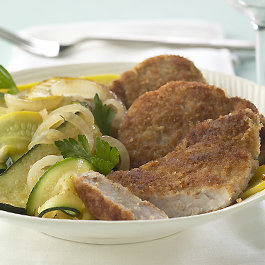 2. Combine crumbs, Parmesan cheese, salt and pepper; dredge pork slices to coat. Heat oil over medium-high heat in nonstick pan. 3. Saute pork for 2 to 3 min. per side; remove and keep warm. Add onion, garlic and zucchini or squash to skillet and sauté 5 min. or until tender. * Add seasoned bread crumbs to add more kick to this dish. Serve these breaded pork medallions with tortellini and sauteed summer squash. * Recipe and photo courtesy of National Pork Board. For more recipes visit: www.PorkBeInspired.com Wine pairings: