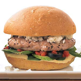 2. Divide turkey into 12 equal portions. Form each into a thin patty, 3 1/2 to 4 in. in diameter. Place patties on a broiler pan lightly coated with cooking spray. 3. Lightly sprinkle patties with salt, pepper and oregano. Bake for 10 to 12 min., until fully cooked. 4. Meanwhile, split rolls in half horizontally. Set tops aside. On bottoms, spread hummus, cover with spinach leaves, top with cucumber slices, and sprinkle with black olives and red peppers. 5. Place hot turkey burgers on top, cover patties with Feta and replace bun tops. Serve immediately. |